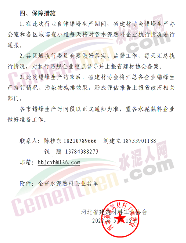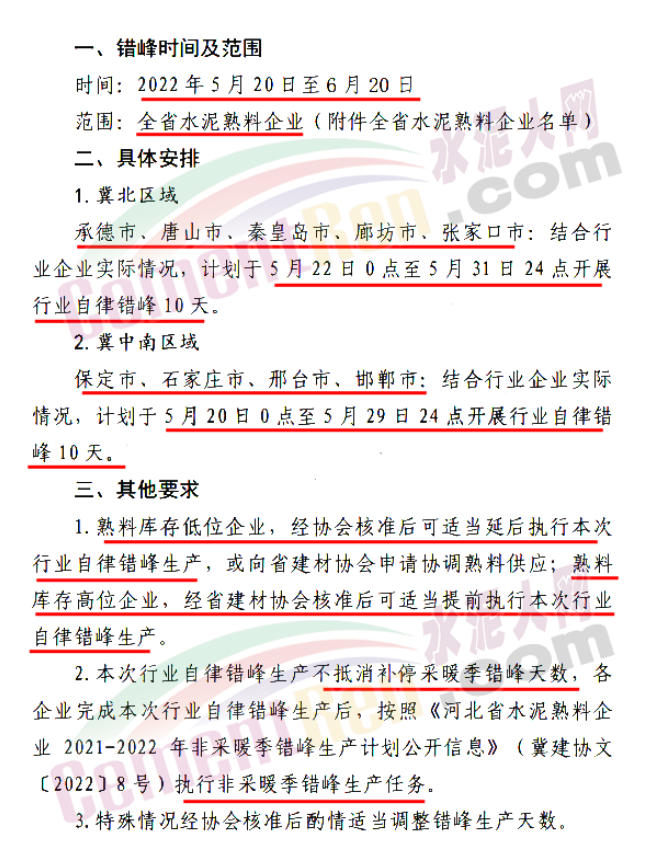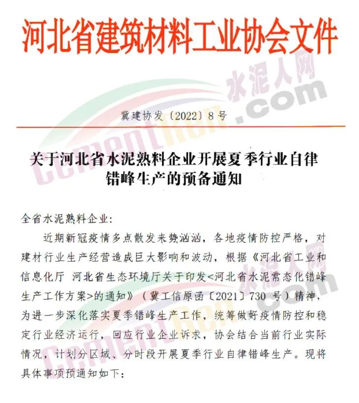 本次行業(yè)自律錯(cuò)峰生產(chǎn)不抵消補(bǔ)停采暖季錯(cuò)峰天數(shù),各企業(yè)完成本次行業(yè)自律錯(cuò)峰生產(chǎn)后,按照《河北省水泥熟料企業(yè)2021-2022年非采暖季錯(cuò)峰生產(chǎn)計(jì)劃公開信息》要求執(zhí)行非采暖季錯(cuò)峰生產(chǎn)任務(wù)。特殊情況經(jīng)協(xié)會(huì)核準(zhǔn)后酌情適當(dāng)調(diào)整錯(cuò)峰生產(chǎn)天數(shù)。 通知原文如下: