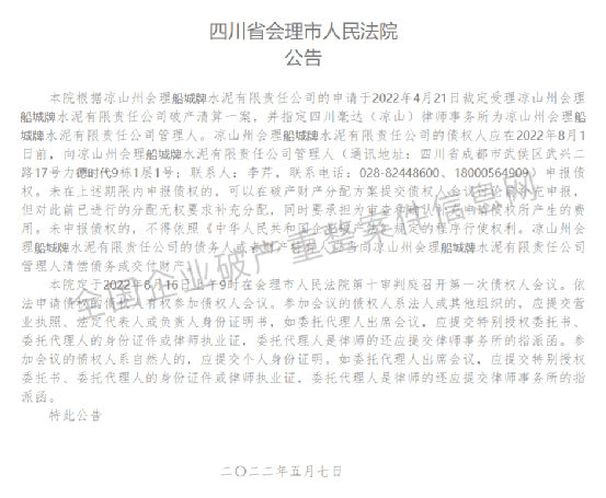 5月7日四川省會理市人民法院公告,根據(jù)涼山州會理船城牌水泥有限責任公司的申請于2022年4月21日裁定受理涼山州會理船城牌水泥有限責任公司破產(chǎn)清算一案,并指定四川毫達(涼山)律師事務所為涼山州會理船城牌水泥有限責任公司管理人。
