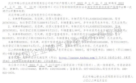 5月5日,武漢市梅山橋業(yè)水泥有限責任公司管理人發(fā)布《剩余破產(chǎn)財產(chǎn)拍賣公告》稱,武漢市梅山橋業(yè)水泥有限責任公司破產(chǎn)財產(chǎn)管理人定于2022年5月21日10時起至2022年5月22日10時對標的物按現(xiàn)狀依法在淘寶網(wǎng)阿里拍賣破產(chǎn)強清平臺第一次進行公開整體拍賣。