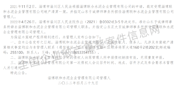 淄博聯(lián)和水泥企業(yè)管理有限公司管理人發(fā)布公告稱,2021年11月2日,淄博市淄川區(qū)人民法根據(jù)淄博聯(lián)合水泥企業(yè)管理有限公司的申請,裁定受理淄博聯(lián)和水泥企業(yè)管理有限公司破產(chǎn)清算一案,并指定山東子誠律師事務所擔任淄博聯(lián)和水泥企業(yè)管理有限公司管理人。2022年4月26日,淄博市淄川區(qū)人民法院作出決定,準許山東子誠律師事務所辭去淄博聯(lián)和水泥企業(yè)管理有限公司管理人職務,并指定山東正大至誠律師事務所擔任淄博聯(lián)和水泥企業(yè)管理有限公司管理人。
