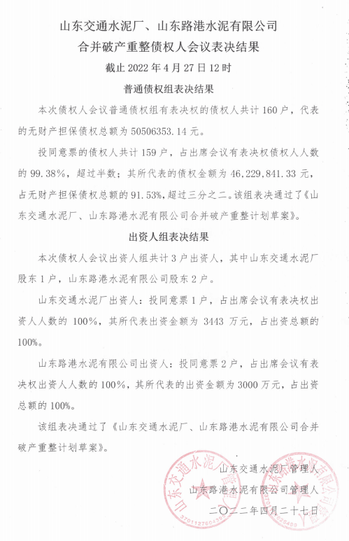 4月27日山東交通水泥廠、山東路港水泥有限公司管理人發(fā)布普通債權(quán)組表決通過了《山東交通水泥廠、山東路港水泥有限公司合并破產(chǎn)重整計劃草案》。