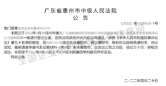 4月20日廣東省惠州市中級人民法院發(fā)布公告稱,法院已于2022年3月29日對申請人廣東駿和德潤投資有限公司申請被申請人龍門縣青溪水泥業(yè)有限責任公司強制清算一案進行登記立案,因無法用其他方式向龍門縣青溪水泥業(yè)有限責任公司送達,依照《中華人民共和國民事訴訟法》第九十五條的規(guī)定,現(xiàn)向其公告送達聽證通知書、異議通知書、告知合議庭成員通知書、訴訟須知、強制清算申請書及證據(jù)材料(共4組)副本等。
