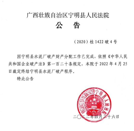 4月26日廣西壯族自治區(qū)寧明縣人民法院發(fā)布公告稱,因?qū)幟骺h水泥廠破產(chǎn)財產(chǎn)分配工作已完成,依照《中華人民共和國企業(yè)破產(chǎn)法》第一百二十條規(guī)定,法院于2022年4月25日裁定終結(jié)寧明縣水泥廠破產(chǎn)程序。