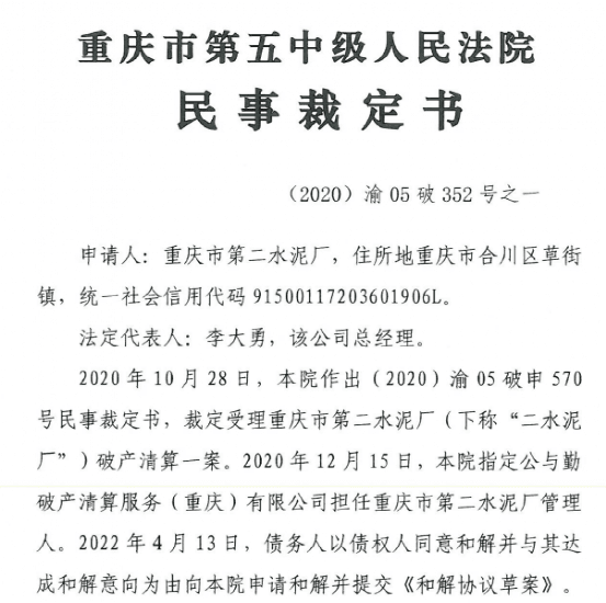 4月19日重慶市第五中級人民法院民事裁定書顯示,重慶市第二水泥廠在法院受理破產(chǎn)申請后,宣告破產(chǎn)。債務人提出的和解協(xié)議草案載明了清償債務的資金來源、清償比例、期限等,符合法律規(guī)定。予以準許。