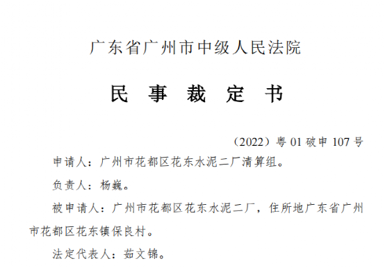 4月8日廣東省廣州市中級人民法院發(fā)布民事裁定書提到,受理廣州市花都區(qū)花東水泥二廠清算組對廣州市花都區(qū)花東水泥二廠的破產(chǎn)清算申請。