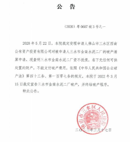 3月27日佛山市三水區(qū)人民法院公告,三水市金南水泥二廠資不抵債,名下無任何可供處理的財產(chǎn),不能支付破產(chǎn)費用,依照相關(guān)規(guī)定315日裁定宣告三水金南水泥二廠破產(chǎn)。