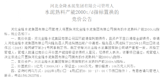 2月26日,河北金隆水泥集團有限公司管理人發(fā)布《水泥熟料產(chǎn)能2000t/d指標置換的競價公告》提到,河北金降隆水泥集團有限公司因不能清償?shù)狡趥鶆?,且資產(chǎn)不足以清償全部債務,申請人河北金隆水泥集團有限公司向隆堯縣人民法院提出破產(chǎn)申請后。隆堯縣人民法院于2015年10月22日依法作出(2015)隆民破字第2-1號民事裁定書,裁定受理河北金隆水泥集團有限公司破產(chǎn)重整一案,并指定管理人。管理人就通過競價公開處置產(chǎn)能指標征求債權(quán)人意見,經(jīng)債權(quán)人表決,該事項已通過?,F(xiàn)管理人決定依法公開置換河北金隆水泥集團有限公司擁有的水泥熟料產(chǎn)能2000t/d指標。