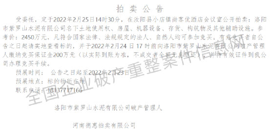 2月17,洛陽市紫羅山水泥有限公司破產(chǎn)管理人河南德惠拍賣有限公司發(fā)布拍賣公告,公開拍賣紫羅山水泥有限公司名下土地使用權(quán)、房屋、機器設(shè)備、存貨、構(gòu)筑物及其他輔助設(shè)施。參考價∶2450萬元,凡符合國家法律、法規(guī)規(guī)定的法人、自然人均可參加競買。