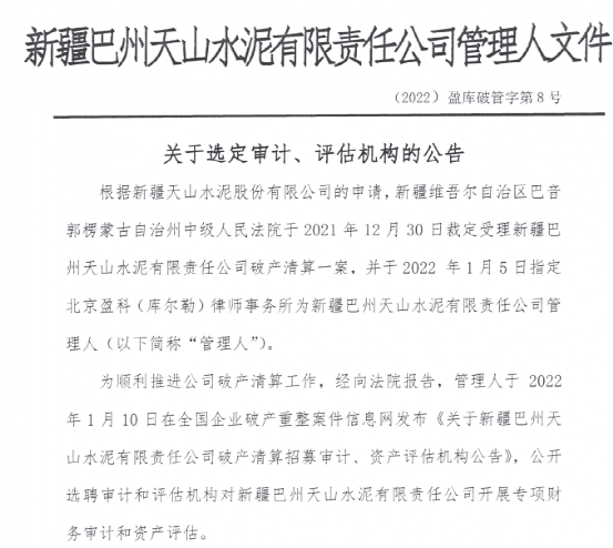 1月23日新疆巴州天山水泥管理人發(fā)布《關(guān)于選定審計、評估機構(gòu)的公告》稱,為順利推進公司破產(chǎn)清算工作,經(jīng)向法院報告管理人于1月10日在全國破產(chǎn)重整案件信息網(wǎng)發(fā)布選聘審計和評估機構(gòu)對新疆巴州天山水泥有限責任公司開展專項財務審計和資產(chǎn)評估。