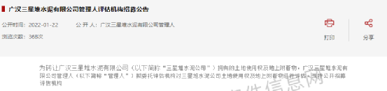 1月22日,廣漢三星堆水泥有限公司管理人發(fā)布《評估機構(gòu)招募公告》稱,為轉(zhuǎn)讓廣漢三星堆水泥有限公司擁有的土地使用權(quán)及地上附著物,廣漢三星堆水泥有限公司管理人擬委托評估機構(gòu)對三星堆水泥公司土地使用權(quán)及地上附著物進行評估。