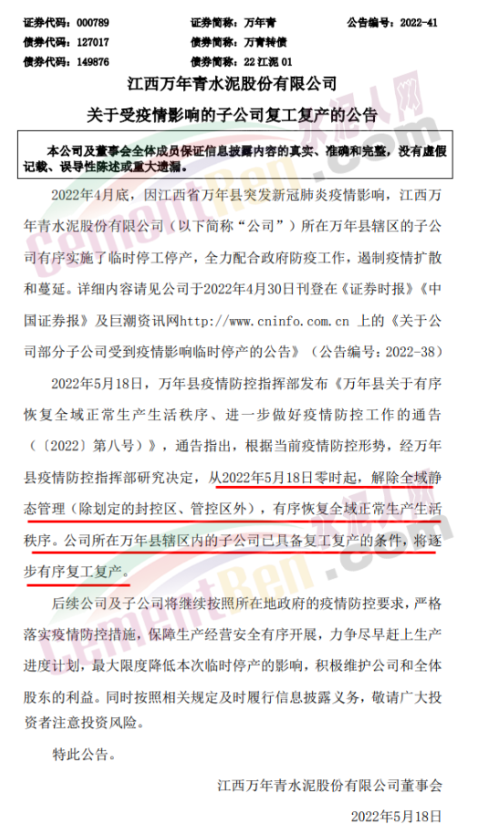 5月18日,江西萬年青水泥股份有限公司(以下簡(jiǎn)稱“萬年青”)發(fā)布關(guān)于受疫情影響的子公司復(fù)工復(fù)產(chǎn)的公告。