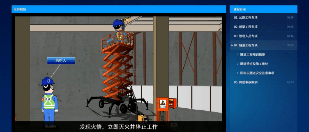 以安全教育培訓(xùn)為例:管理人員無需費(fèi)時(shí)費(fèi)力準(zhǔn)備復(fù)雜的資料,通過工具箱系統(tǒng)選擇課程或自主創(chuàng)建培訓(xùn)方案,啟動(dòng)集中培訓(xùn)后,系統(tǒng)將按照培訓(xùn)專題自動(dòng)播放多媒體安全培訓(xùn)課件,課程全部采用多媒體形式,學(xué)員集中接受安全培訓(xùn)。培訓(xùn)課程風(fēng)格多樣,有2D/3D卡通風(fēng)格、MG動(dòng)畫風(fēng)格和宣教寫實(shí)風(fēng)格等。課件趣味性強(qiáng),以較夸張的卡通風(fēng)格人物、場(chǎng)景演繹事故風(fēng)險(xiǎn),通俗易懂的語言突出重點(diǎn)知識(shí)點(diǎn),直觀生動(dòng)不乏味,令員工記憶深刻。