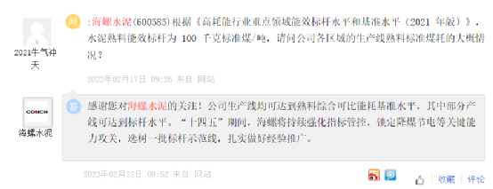 冀東水泥回復投資者時稱,近幾年,公司一直積極推進節(jié)能降耗工作,目前運行的熟料生產線有15%的能耗達到能耗標桿水平,預計到2023年末,比例還有大幅提升的空間;公司除個別將要進行產能置換的熟料生產線外,其他熟料生產線基本都能達到能耗基準水平,目前還在提升優(yōu)化。