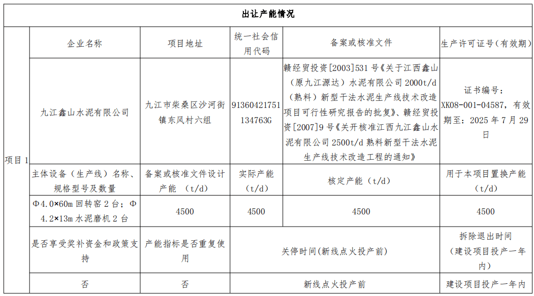 據(jù)水泥人網(wǎng)了解,早在2020年11月江西工信廳發(fā)布九江鑫山水泥有限公司公司 4500t/d水泥熟料生產(chǎn)線產(chǎn)能置換的公示提到,九江鑫山水泥有限公司由于處于九江高鐵新區(qū)核心區(qū)域內(nèi),不符合城市發(fā)展規(guī)劃要求,需進(jìn)行異地搬遷。該企業(yè)將異地搬遷一條4500t/d水泥熟料生產(chǎn)線至九江市柴桑區(qū)涌泉鄉(xiāng)泉塘畈村郭明灣自然村,其中置換比例為1:1。