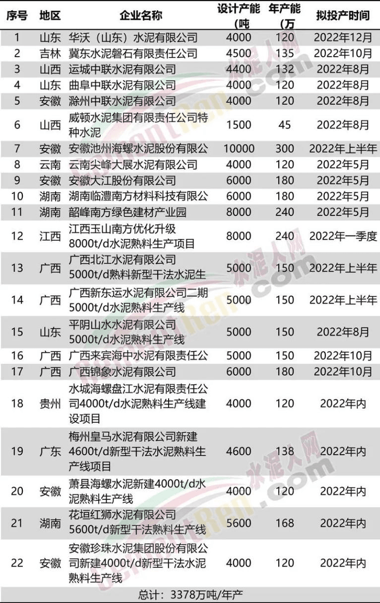 據(jù)水泥人網(wǎng)此前消息,原計劃于今年內(nèi)投產(chǎn)的22條熟料生產(chǎn)線項,目前已點火和已開建,且明確今年內(nèi)點火投產(chǎn)的項目共11條線分別為:1 江西玉山南方8000t/d水泥熟料生產(chǎn)線于2020年12月23日開工,原計劃于今年一季度點火投產(chǎn)。目前熟料項目已經(jīng)達產(chǎn),日產(chǎn)量在9800-10200噸,道路和綠化是還在施工中;2 廣西新東運水泥5000t/d水泥熟料生產(chǎn)線,已點火;3 韶峰南方8000t/d水泥熟料生產(chǎn)線,已點火;4 廣西錦象水泥6000t/d水泥熟料生產(chǎn)線一線暫定7月8日點火投產(chǎn),二線暫定下半年點火投產(chǎn);5 廣西都安上峰水泥一線5000t/d熟料生產(chǎn)線計劃于7月投產(chǎn);6 平陰山水水泥5000t/d水泥熟料生產(chǎn)線,計劃于8月點火;7 池州海螺10000t/d水泥熟料生產(chǎn)線,計劃于8月點火投產(chǎn);8 廣西北江水泥5000t/d水泥熟料生產(chǎn)線,原計劃上半年投產(chǎn),目前仍處于建設和設備調(diào)試中。上周內(nèi)回轉(zhuǎn)窯筒體吊裝合攏,預計于今年下半年內(nèi)點火投產(chǎn);9 水城海螺盤江水泥4000t/d水泥熟料生產(chǎn)線已開工建設,原計劃于2022年底前點火投產(chǎn);10 安徽珍珠水泥4000t/d水泥熟料生產(chǎn)線已開工建設,原計劃于今年內(nèi)點火投產(chǎn)。