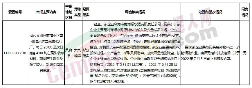 鳳臺縣旭日藍(lán)灣小區(qū)南側(cè)淮河對面海螺水泥廠,每日20:00至次日凌晨4:00均在碼頭裝卸材料,期間產(chǎn)生噪音及揚塵較大,影響周圍居民生活。