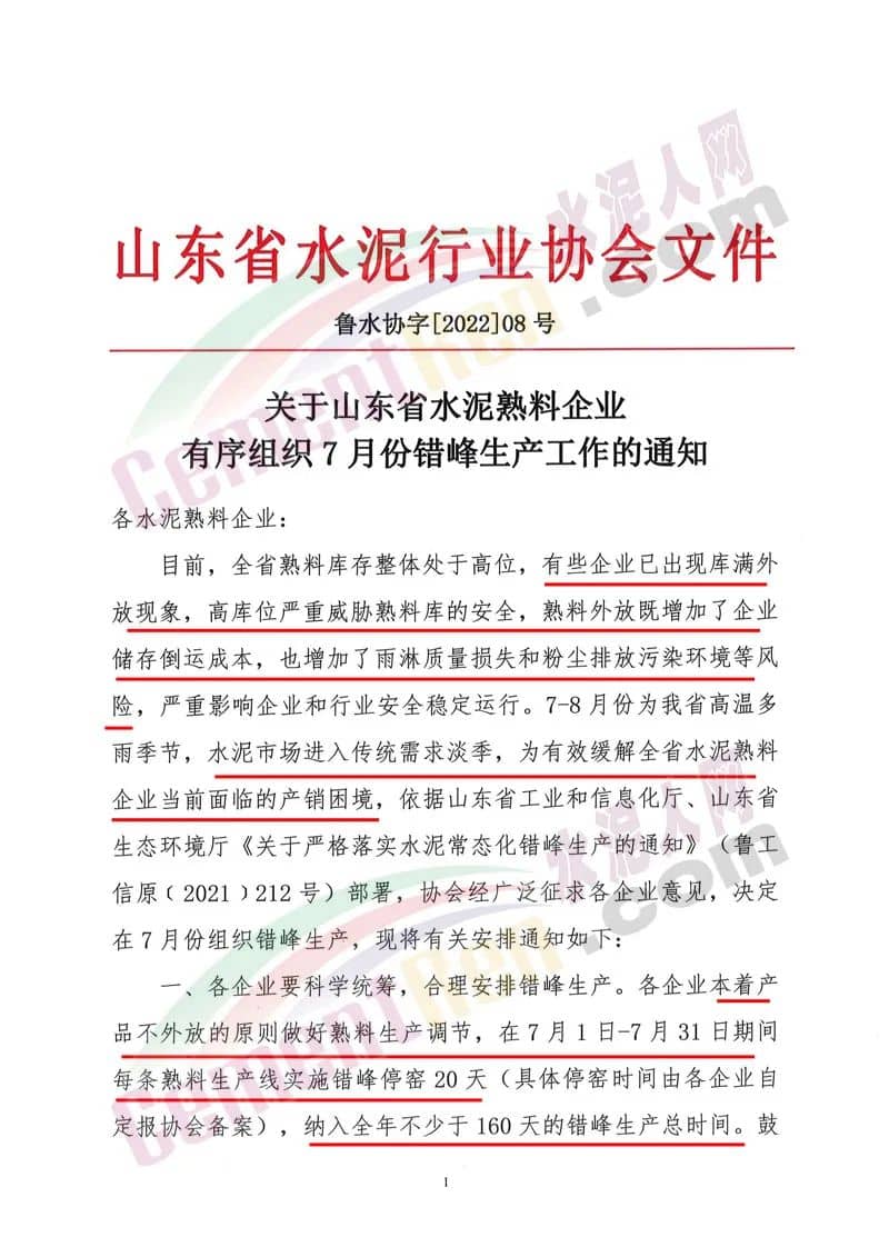 7-8月份為山東省高溫多雨季節(jié),水泥市場(chǎng)進(jìn)入傳統(tǒng)需求淡季,為有效緩解全省水泥熟料企業(yè)當(dāng)前面臨的產(chǎn)銷困境,依據(jù)山東省工業(yè)和信息化廳、山東省生態(tài)環(huán)境廳《關(guān)于嚴(yán)格落實(shí)水泥常態(tài)化錯(cuò)峰生產(chǎn)的通知》(魯工信原(2021)212號(hào))部署,協(xié)會(huì)經(jīng)廣泛征求各企業(yè)意見,決定在7月份組織錯(cuò)峰生產(chǎn)。