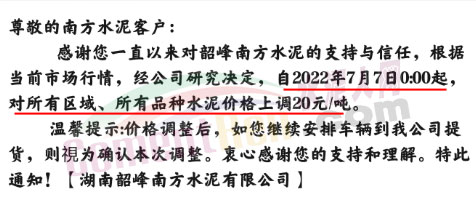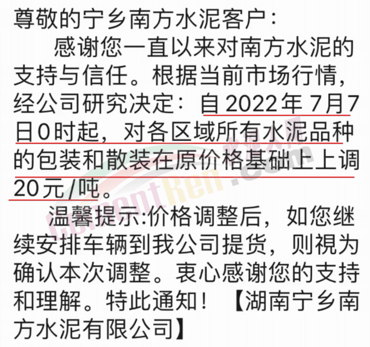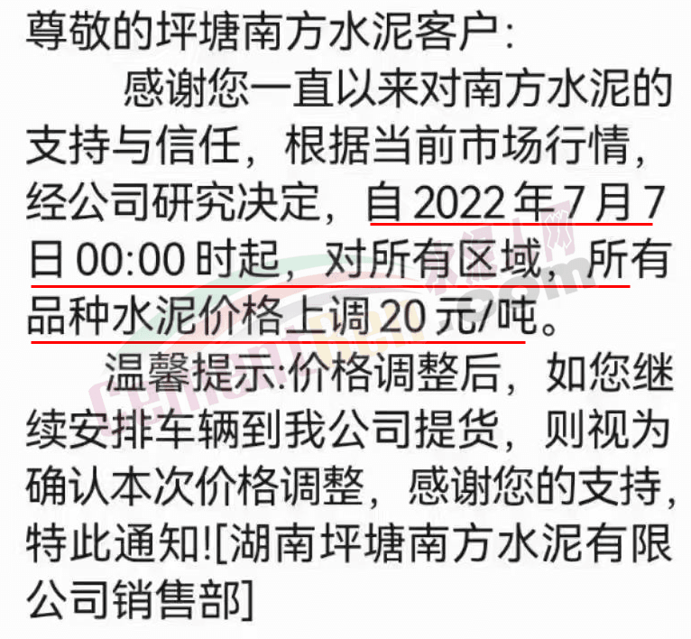 湖南寧鄉(xiāng)南方水泥有限公司通知,7月7日零時(shí)起,對(duì)各區(qū)域所有水泥品種的包裝和散裝在原價(jià)基礎(chǔ)上上調(diào)20元/噸。