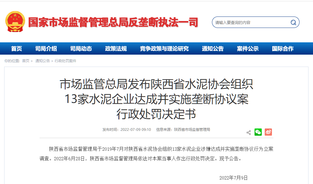 日前,國家市場監(jiān)管總局發(fā)布陜西省水泥協(xié)會組織13家水泥企業(yè)達(dá)成并實(shí)施壟斷協(xié)議案行政處罰決定書稱,陜西省市場監(jiān)督管理局于2019年7月對陜西省水泥協(xié)會組織13家水泥企業(yè)涉嫌達(dá)成并實(shí)施壟斷協(xié)議行為立案調(diào)查。2022年6月28日,陜西省市場監(jiān)督管理局依法對本案當(dāng)事人作出行政處罰決定?,F(xiàn)予公告。