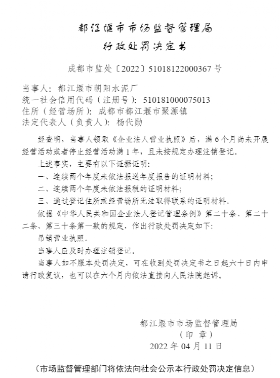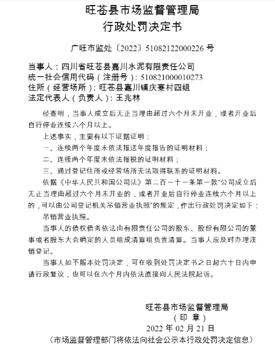 同期,旺蒼縣市場監(jiān)督管理局行政處罰決定書顯示,四川省旺蒼縣嘉川水泥有限責任公司成立后無正當理由超過六個月未開業(yè),或者開業(yè)后自行停業(yè)連續(xù)六個月以上。依據(jù)《中華人民共和國公司法》第二百一十一條第一款“公司成立后無正當理由超過六個月未開業(yè)的,或者開業(yè)后自行停業(yè)連續(xù)六個月以上的,可以由公司登記機關吊銷營業(yè)執(zhí)照”的規(guī)定,作出行政處罰決定吊銷營業(yè)執(zhí)照。