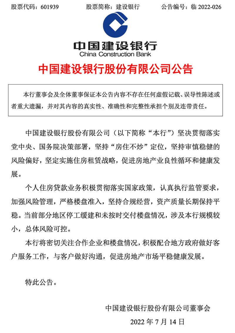 建設(shè)銀行稱,將密切關(guān)注合作企業(yè)和樓盤情況,積極配合地方政府做好客戶服務(wù)工作,與客戶做好溝通,促進房地產(chǎn)市場平穩(wěn)健康發(fā)展。