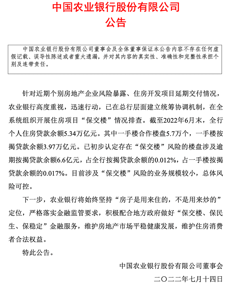 公告稱,截至2022年6月末,農(nóng)業(yè)銀行全行個人住房貸款余額5.34萬億元。其中一手樓合作樓盤5.7萬個,一手樓按揭貸款余額3.97萬億元。已初步認定存在“保交樓”風(fēng)險的樓盤涉及逾期按揭貸款余額6.6億元,占全行按揭貸款余額的0.012%,占一手樓按揭貸款余額的0.017%。目前涉及“保交樓”風(fēng)險的業(yè)務(wù)規(guī)模較小,總體風(fēng)險可控。