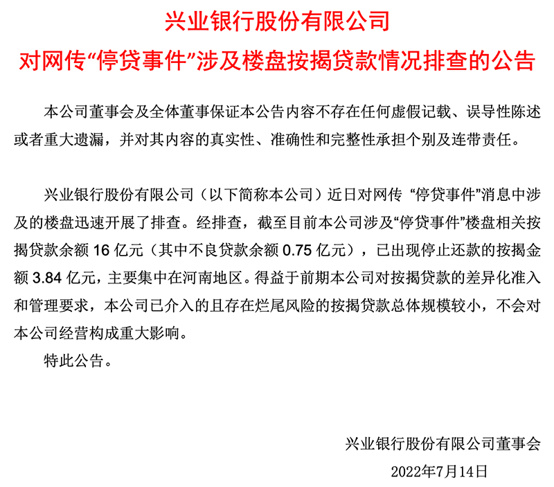 興業(yè)銀行發(fā)布公告稱,近日對網(wǎng)傳“停貸事件”消息中涉及的樓盤迅速開展了排查。經(jīng)排查,截至目前,該行涉及“停貸事件”樓盤相關(guān)按揭貸款余額16億元(其中不良貸款余額0.75億元),已出現(xiàn)停止還款的按揭金額3.84億元,主要集中在河南地區(qū)。