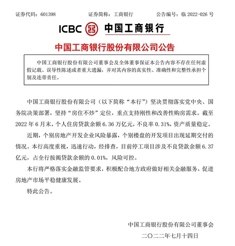 工商銀行公告稱,該行堅決貫徹落實黨中央、國務(wù)院決策部署,堅持“房住不炒”定位,重點支持剛性和改善性購房需求。截至2022年6月末,個人住房貸款余額6.36萬億元,不良率0.31%,資產(chǎn)質(zhì)量穩(wěn)定。