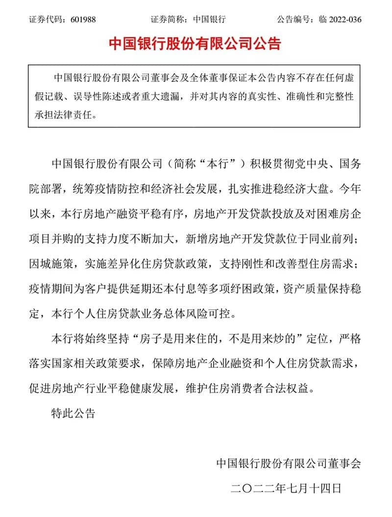 中國銀行公告稱,今年以來,該行房地產(chǎn)融資平穩(wěn)有序,房地產(chǎn)開發(fā)貸款投放及對困難房企項目并購的支持力度不斷加大,新增房地產(chǎn)開發(fā)貸款位于同業(yè)前列;因城施策,實施差異化住房貸款政策,支持剛性和改善型住房需求;疫情期間為客戶提供延期還本付息等多項紓困政策,資產(chǎn)質(zhì)量保持穩(wěn)定,該行個人住房貸款業(yè)務(wù)總體風(fēng)險可控。