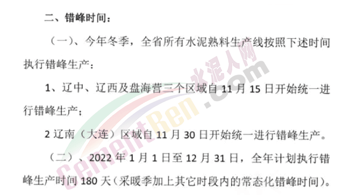 據(jù)水泥人網(wǎng)此前報道,早在去年12月遼寧省建筑材料工業(yè)協(xié)會水泥分會就發(fā)布了《遼寧省水泥行業(yè)2021年冬季和2022年錯峰生產(chǎn)方案》要求:2022年1月1日至12月31日,全年計劃執(zhí)行錯峰生產(chǎn)時間180天。