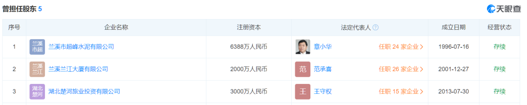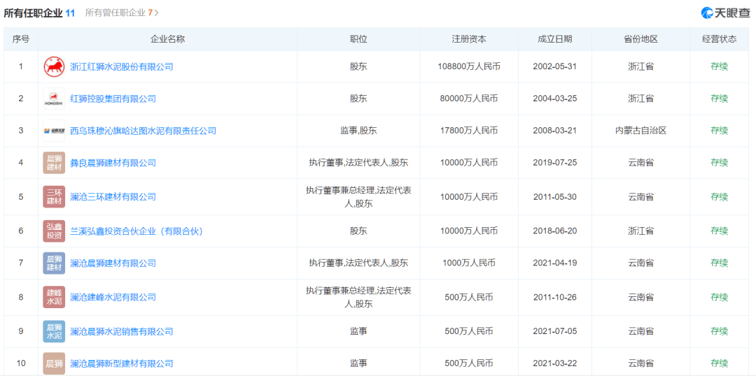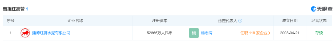 天眼查顯示,楊志明還曾擔任浙江紅獅水泥股份有限公司、紅獅控股集團有限公司、西烏珠穆沁旗哈達圖水泥有限責任公司等多家企業(yè)股東。