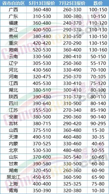 綜合水泥人網(wǎng)信息中心重點監(jiān)管控的600多家水泥企業(yè)數(shù)據(jù)來看,5月中旬至7月25日期間除西藏區(qū)域上調(diào)60元/噸,寧夏區(qū)域個別企業(yè)上調(diào)45元/噸外,新疆價格無變動外,其余28個區(qū)域全部為降。吉林延邊朝鮮族自治州主要品牌企業(yè)5月中旬至今報價最高跌295元/噸。