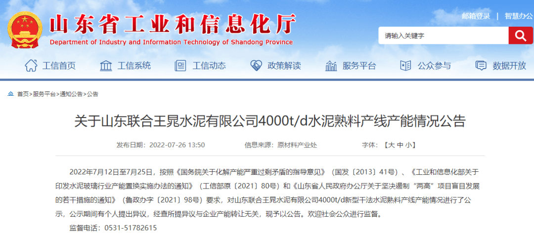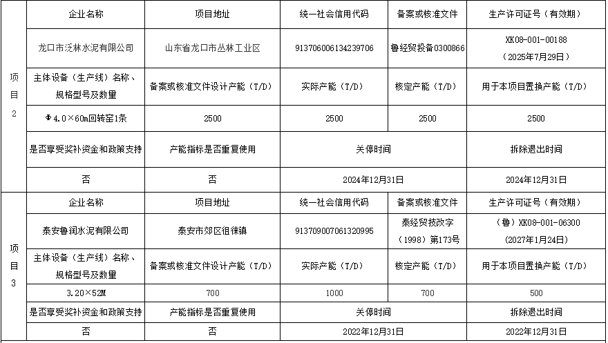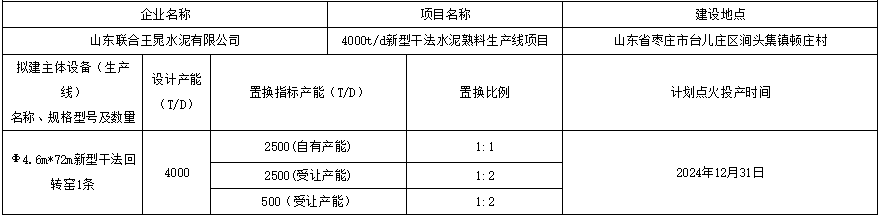 日前,山東工信廳發(fā)布公告稱,按照相關(guān)文件要求,對山東聯(lián)合王晁水泥有限公司4000t/d新型干法水泥熟料產(chǎn)線產(chǎn)能情況進行公告。項目通過拆除山東聯(lián)合王晁水泥有限公司自有2500t/d以及龍口市泛林水泥有限公司2500t/d和泰安魯潤水泥有限公司1000t/d熟料生產(chǎn)線新建一條4000t/d熟料生產(chǎn)線,建設(shè)地址位于山東省棗莊市臺兒莊區(qū)澗頭集鎮(zhèn)頓莊村。擬建主體將采用Φ4.6m*72m新型干法回轉(zhuǎn)窯1條。計劃點火投產(chǎn)時間為2024年12月31日。