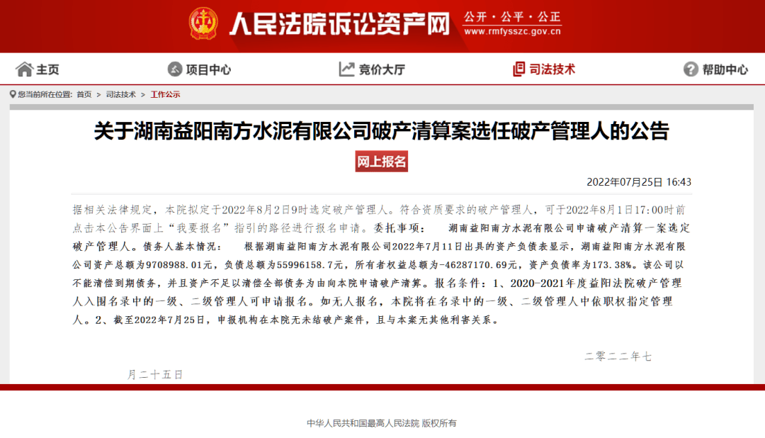 日前,人民法院訴訟資產(chǎn)網(wǎng)發(fā)布《關(guān)于湖南益陽南方水泥有限公司破產(chǎn)清算案選任破產(chǎn)管理人的公告》稱,據(jù)相關(guān)法律規(guī)定,法院擬定于2022年8月2日9時(shí)選定破產(chǎn)管理人。符合資質(zhì)要求的破產(chǎn)管理人,可于2022年8月1日17:00時(shí)前點(diǎn)擊本公告界面上“我要報(bào)名”指引的路徑進(jìn)行報(bào)名申請(qǐng)。