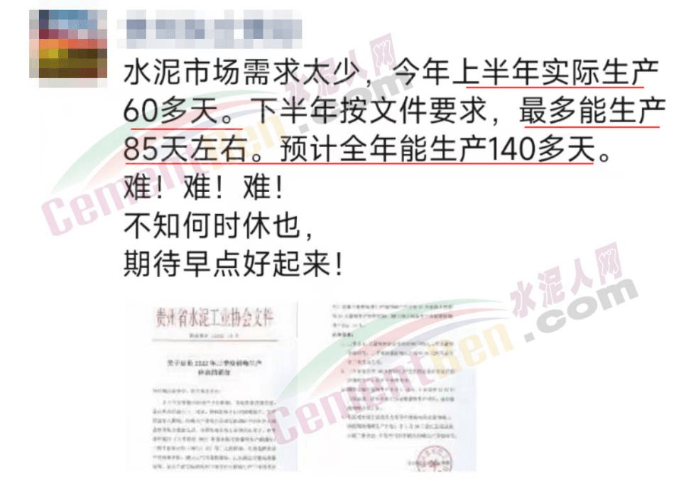 貴州某企業(yè)負責人反饋稱,今年水泥市場需求太少,上半年實際生產(chǎn)60多天。按文件要求,下半年最多能生產(chǎn)85天左右,預計全年能生產(chǎn)140多天。
