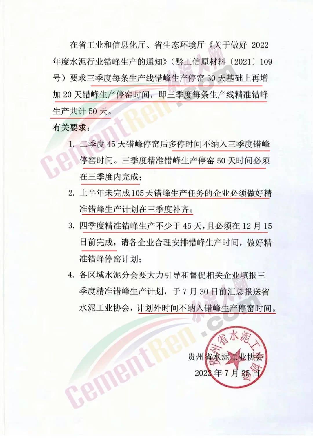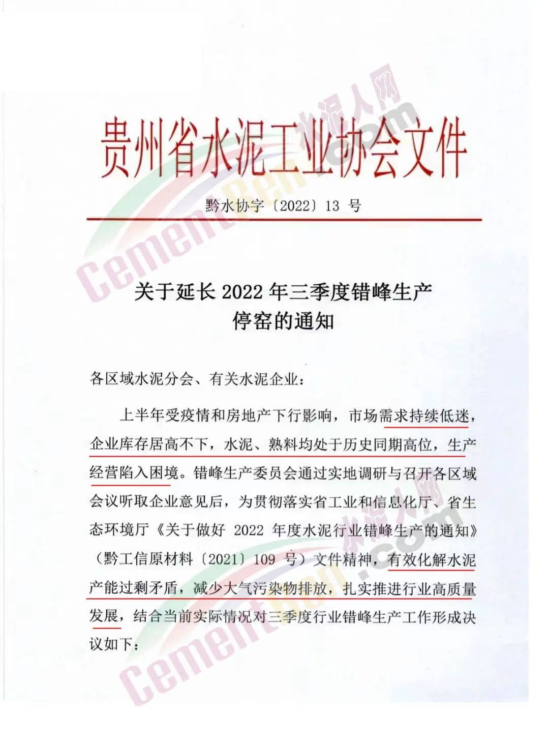 日前,貴州省水泥工業(yè)協(xié)會發(fā)布《關于延長2022年三季度錯峰生產(chǎn)停窯的通知》要求三季度在每條生產(chǎn)線錯峰生產(chǎn)停窯30天基礎上再增加20天錯峰生產(chǎn)停窯時間,即三季度每條生產(chǎn)線精準錯峰生產(chǎn)共計50天。