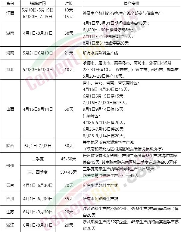 二季度45天錯峰停窯后多停時間不納入三季度錯峰停窯時間。三季度精準錯峰生產(chǎn)停窯50天時間必須在三季度內(nèi)完成;上半年未完成105天錯峰生產(chǎn)任務的企業(yè)必須做好精準錯峰生產(chǎn)計劃在三季度補齊;四季度精準錯峰生產(chǎn)不少于45天,且必須在12月15日前完成; 計劃外時間不納入錯峰生產(chǎn)停窯時間。