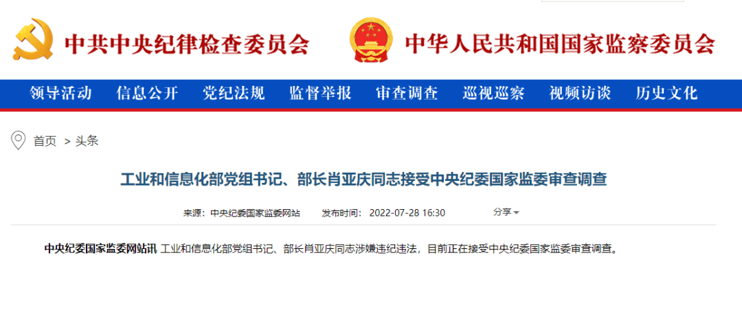 7月28日,中央紀(jì)委國家監(jiān)委網(wǎng)站訊 工業(yè)和信息化部黨組書記、部長肖亞慶同志涉嫌違紀(jì)違法,目前正在接受中央紀(jì)委國家監(jiān)委審查調(diào)查。