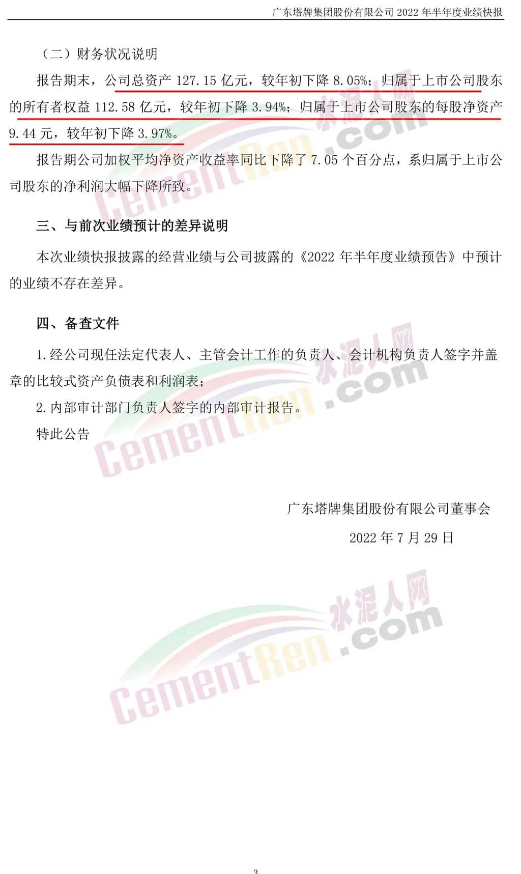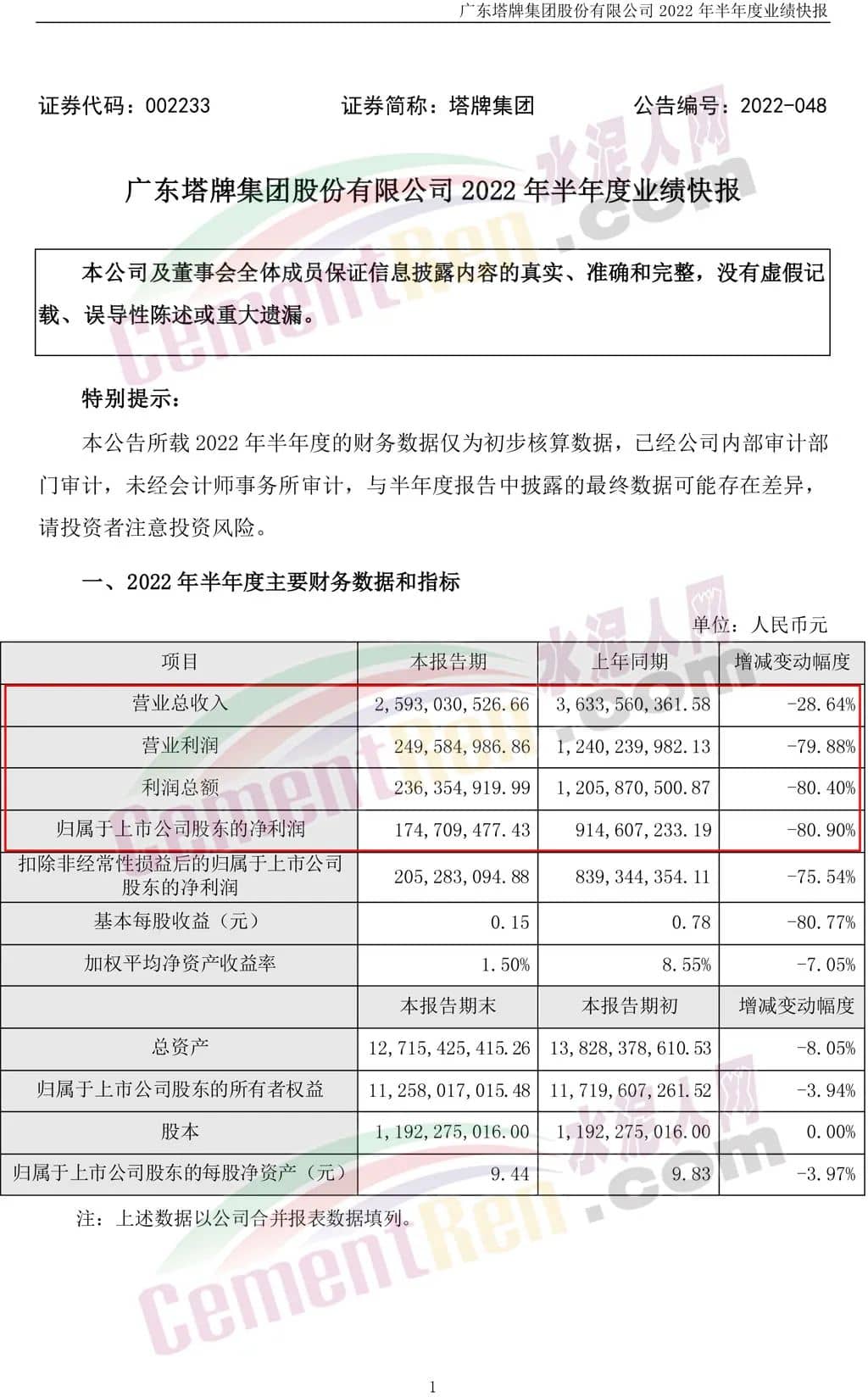 塔牌集團(002233)7月28日晚間發(fā)布業(yè)績快報,2022年半年度營業(yè)收入為25.93億元,同比下滑28.64%;歸母凈利潤1.75億元,同比下滑80.9%;基本每股收益0.15元。