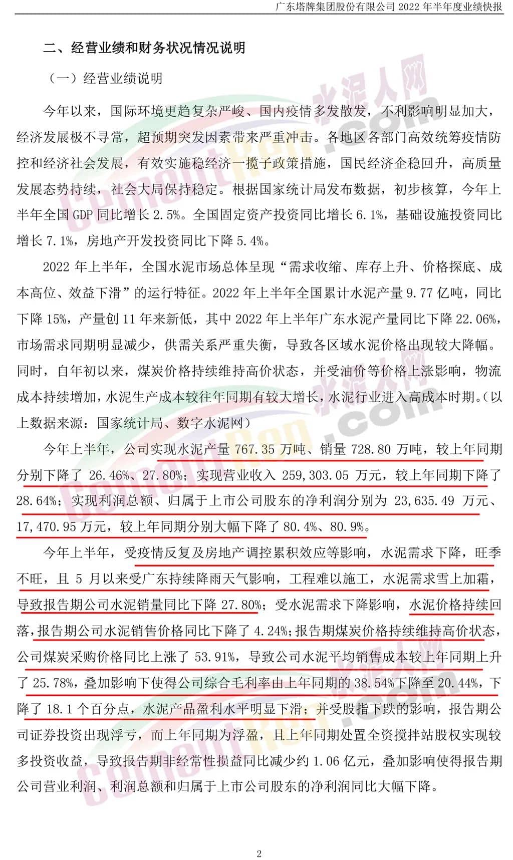 今年上半年,受疫情反復(fù)及房地產(chǎn)調(diào)控累積效應(yīng)等影響,水泥需求下降,旺季不旺,且5月以來受廣東持續(xù)降雨天氣影響,工程難以施工,水泥需求雪上加霜,導致報告期公司水泥銷量同比下降27.80%;受水泥需求下降影響,水泥價格持續(xù)回落,報告期公司水泥銷售價格同比下降了4.24%;報告期煤炭價格持續(xù)維持高價狀態(tài),導致公司水泥平均銷售成本較上年同期上升了25.78%。