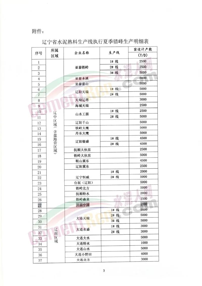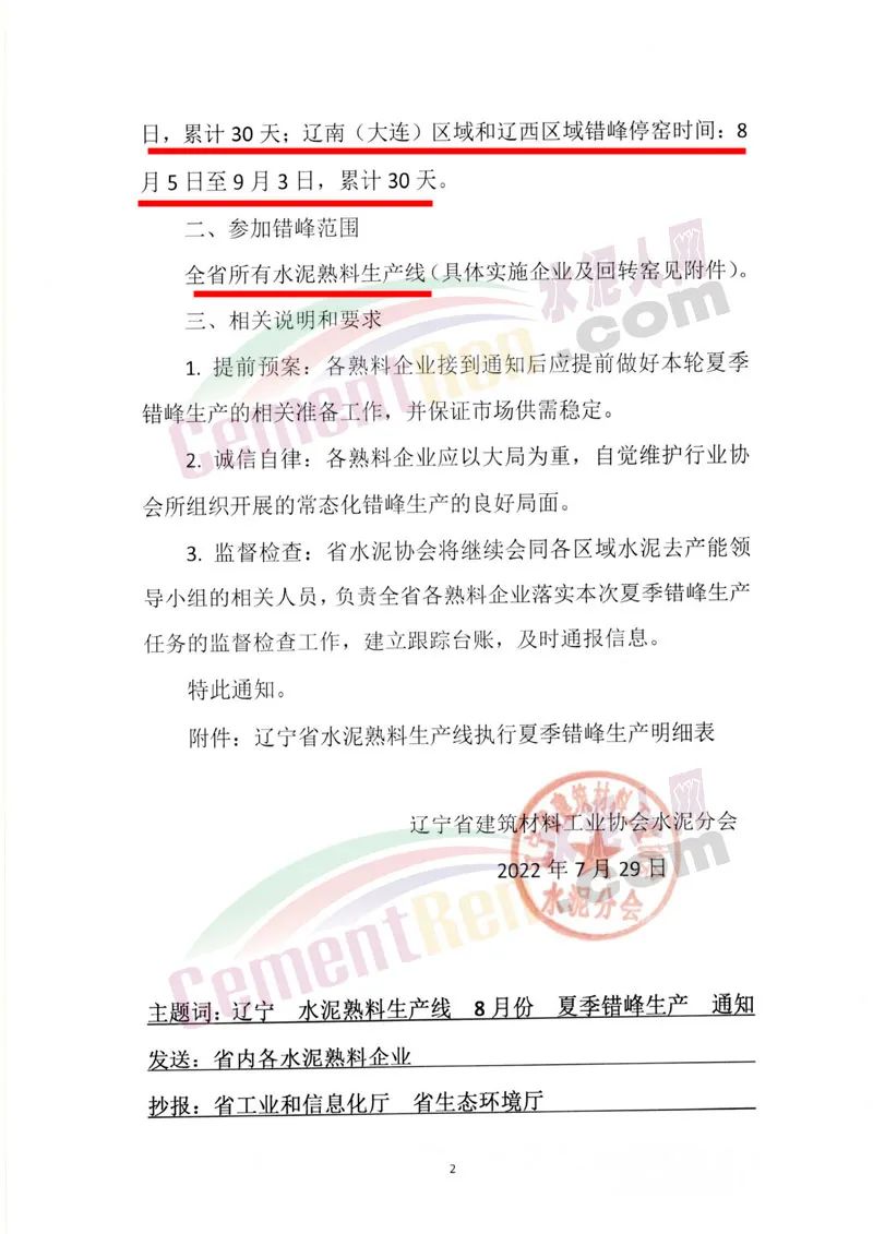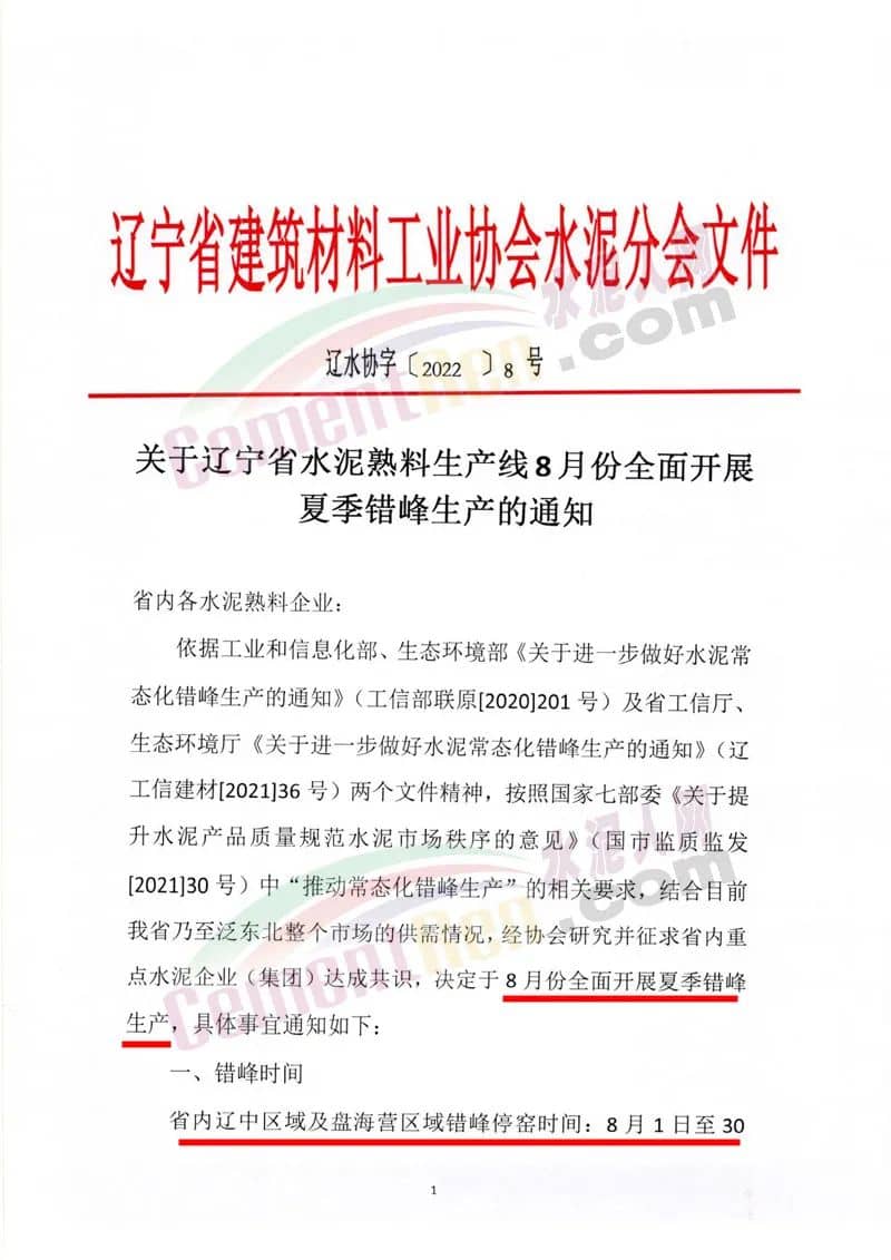 日前,遼寧省建筑材料工業(yè)協(xié)會水泥分會發(fā)布《關(guān)于遼寧省水泥熟料生產(chǎn)線8月份全面開展夏季錯峰生產(chǎn)的通知》給省內(nèi)各水泥熟料企業(yè)稱,依據(jù)相關(guān)文件要求,結(jié)合目前遼寧省乃至泛東北整個市場的供需情況,經(jīng)協(xié)會研究并征求省內(nèi)重點水泥企業(yè)(集團(tuán))達(dá)成共識,決定全省所有水泥熟料生產(chǎn)線8月份全面開展夏季錯峰生產(chǎn)。遼中區(qū)域及盤海營區(qū)域錯峰停窯時間:8月1日至30日,累計30天;遼南(大連)區(qū)域和遼西區(qū)域錯峰停窯時間:8月5日至9月3日,累計30天。