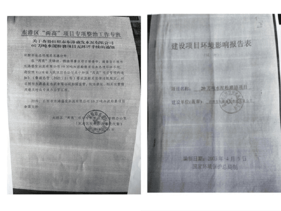 “在‘兩高’及鑄造、鍛造等重點項目排查中,排查出日照市東港盛發(fā)水泥有限公司60萬噸水泥粉磨項目未辦理環(huán)評手續(xù),請按照《山東省人民政府辦公廳關于加強‘兩高’項目管理的通知》(魯政辦字[2021]57號)要求及相關法律法規(guī)規(guī)定,對日照市東港盛發(fā)水泥有限公司加強監(jiān)管,依法查處。相關處置情況請及時向?qū)0噢k公室匯報。”