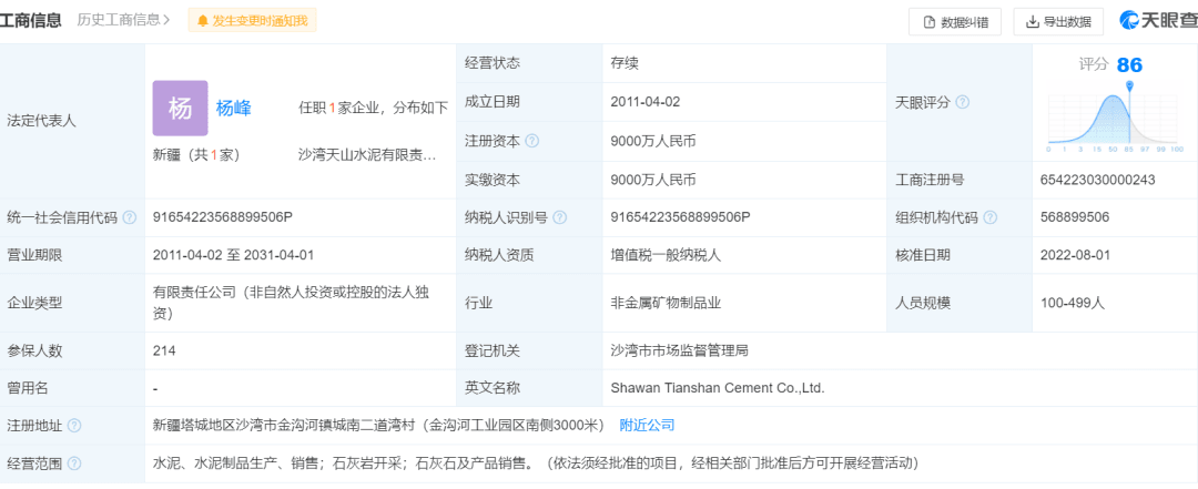 天眼查App顯示,2022年8月1日沙灣天山水泥有限責任公司發(fā)生工商變更,法定代表人由徐克瑞變更為楊峰。