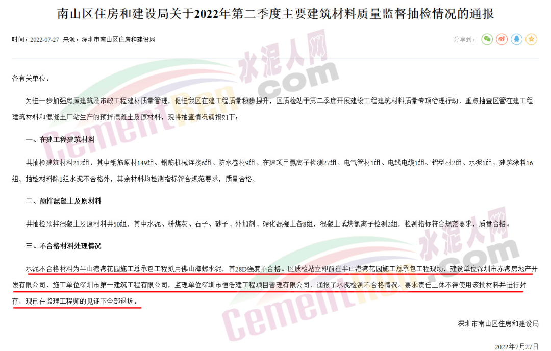 水泥不合格材料為半山港灣花園施工總承包工程擬用佛山海螺水泥,其28D強度不合格。區(qū)質(zhì)檢站立即前往半山港灣花園施工總承包工程現(xiàn)場,建設(shè)單位深圳市赤灣房地產(chǎn)開發(fā)有限公司,施工單位深圳市第一建筑工程有限公司,監(jiān)理單位深圳市恒浩建工程項目管理有限公司,通報了水泥檢測不合格情況。要求責(zé)任主體不得使用該批材料并進(jìn)行封存,現(xiàn)已在監(jiān)理工程師的見證下全部退場。