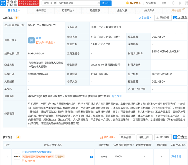 企查查APP顯示,8月9日,海螺(廣西)控股有限公司成立,法定代表人為陶勇,注冊(cè)資本1億元人民幣,經(jīng)營(yíng)范圍包含:水泥制品制造;新型建筑材料制造(不含危險(xiǎn)化學(xué)品);輕質(zhì)建筑材料制造;煤炭及制品銷(xiāo)售等。企查查股權(quán)穿透顯示,該公司由海螺水泥100%控股。