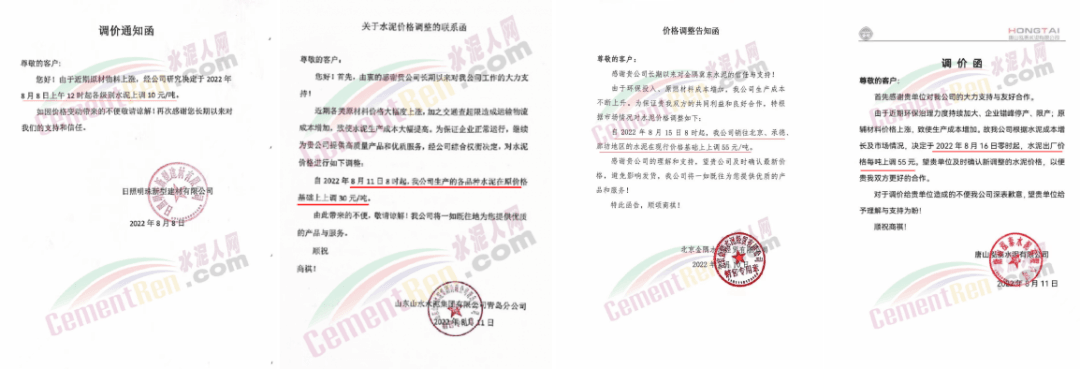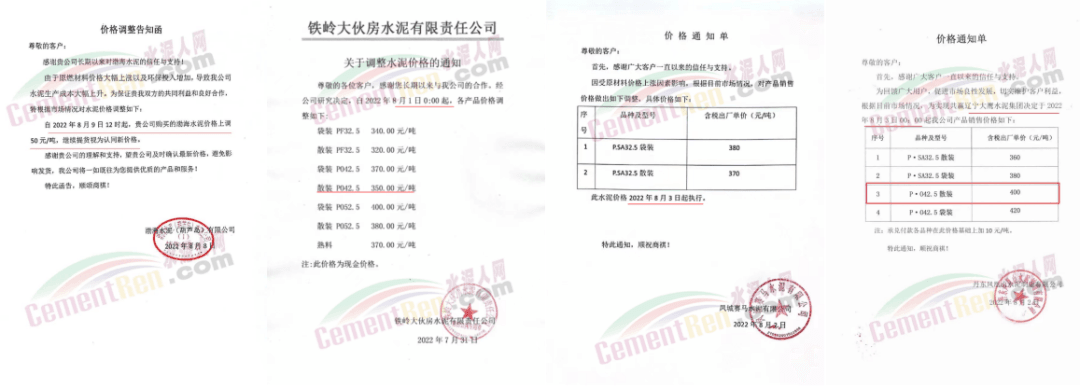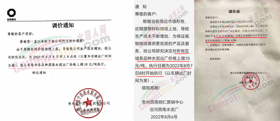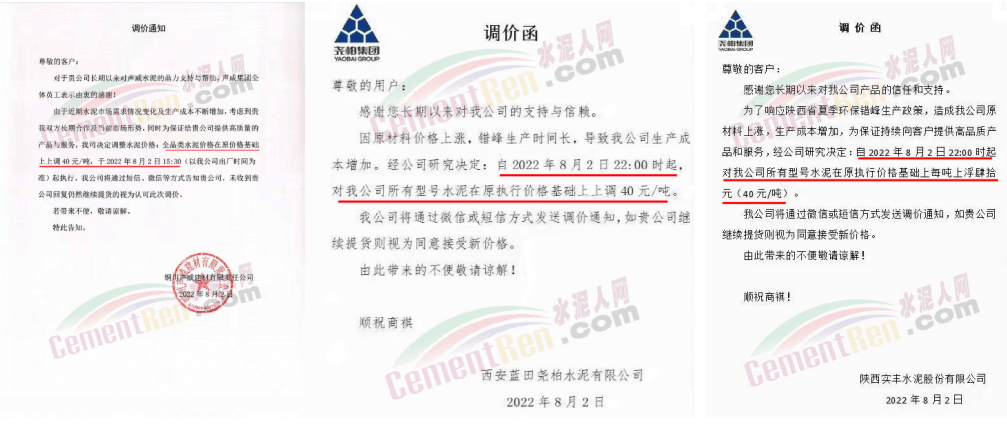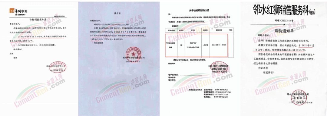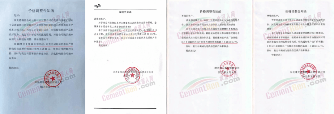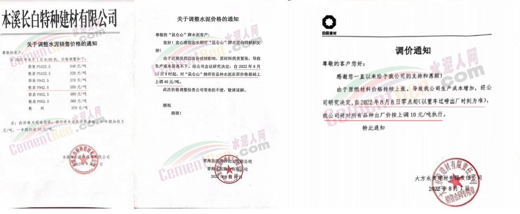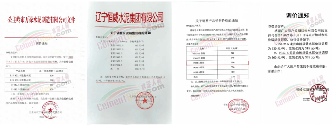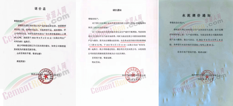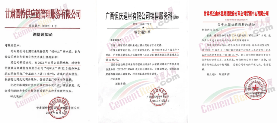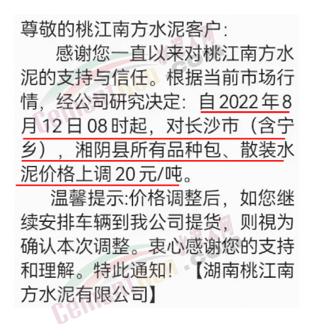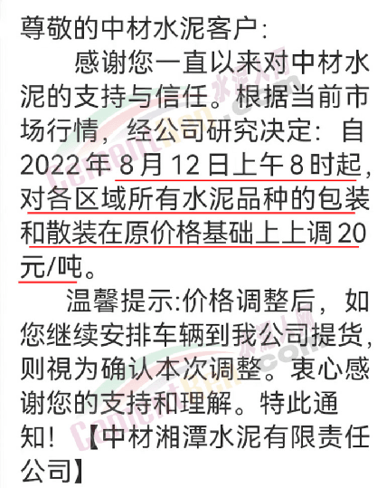 中材湘潭水泥有限責(zé)任公司通知,根據(jù)當(dāng)前市場(chǎng)行情,經(jīng)公司研究決定自2022年8月12日上午8時(shí)起,對(duì)各區(qū)域所有水泥品種的包裝和散裝在原價(jià)格基礎(chǔ)上上調(diào)20元/噸。價(jià)格調(diào)整后,如繼續(xù)安排車輛到公司提貨,則視為確認(rèn)本次調(diào)整。