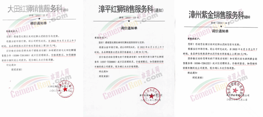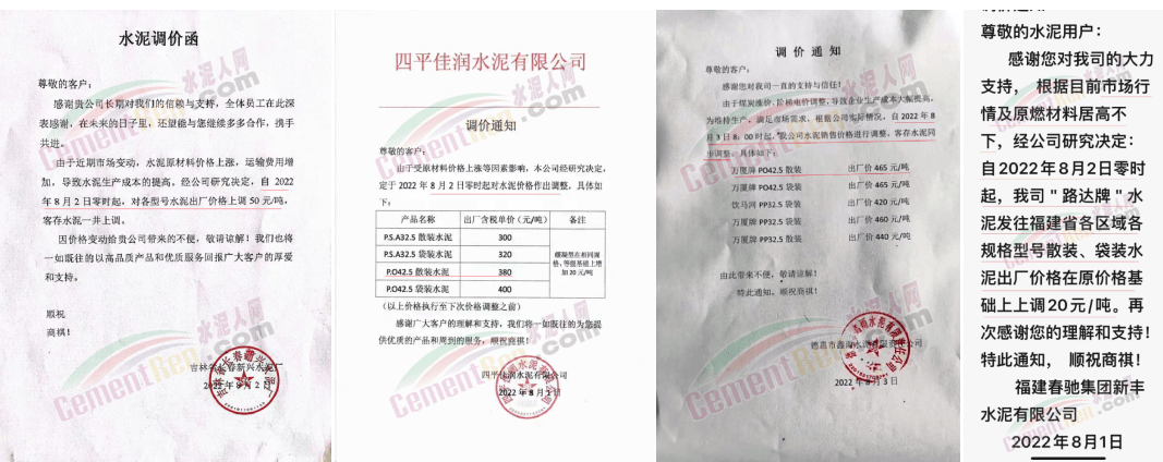 近來(lái)多區(qū)域通知上調(diào)水泥價(jià)格。日前,桃江南方水泥通知,根據(jù)當(dāng)前市場(chǎng)行情,經(jīng)公司研究決定自2022年8月12日08時(shí)起,對(duì)長(zhǎng)沙市(含寧鄉(xiāng)),湘陰縣所有品種包、散裝水泥價(jià)格上調(diào)20元/噸。價(jià)格調(diào)整后,如繼續(xù)安排車輛到公司提貨,則視為確認(rèn)本次調(diào)整。