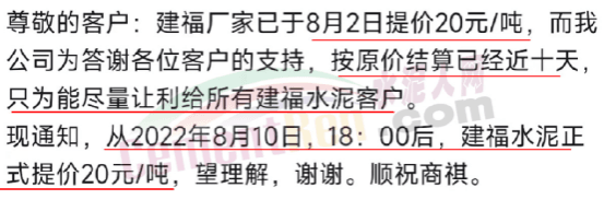 建福水泥廠下屬企業(yè)日前發(fā)通知給客戶稱,廠家已于8月初提價(jià),而公司為了答謝客戶的支持,盡量讓利給所有建福水泥客戶,已經(jīng)延遲十天提價(jià)。