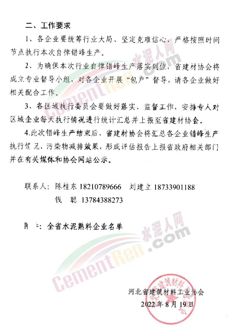 日前,河北省建筑材料工業(yè)協(xié)會發(fā)布《關于河北省水泥熟料企業(yè)開展穩(wěn)增長促發(fā)展行業(yè)自律錯峰生產(chǎn)的通知》,是覅有河北全省水泥熟料企業(yè)自2022年8月25日~9月13日,錯峰停窯20天。