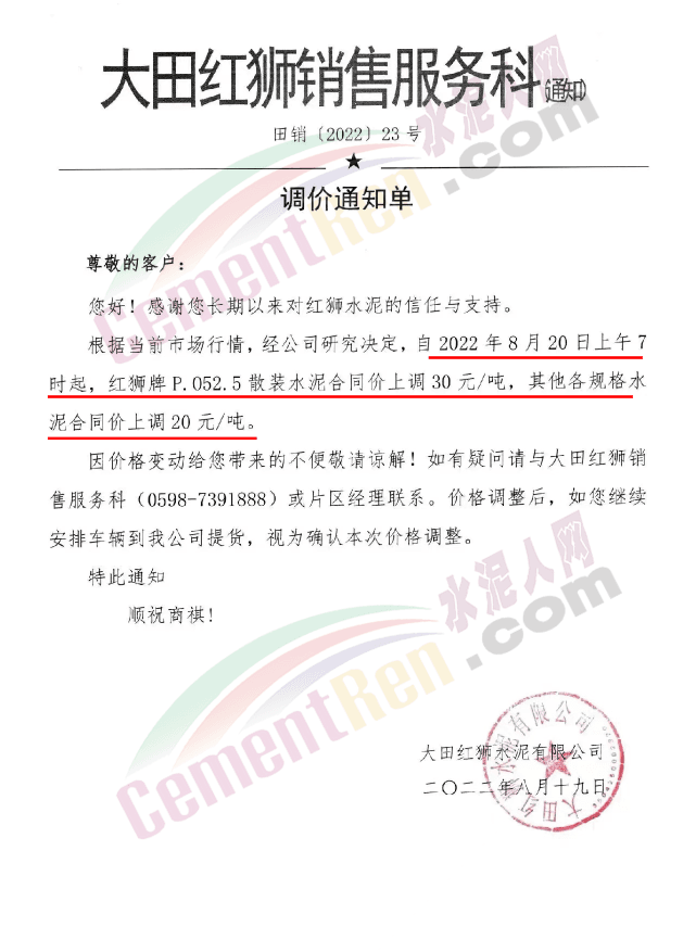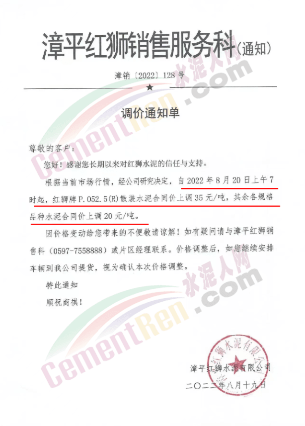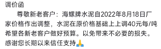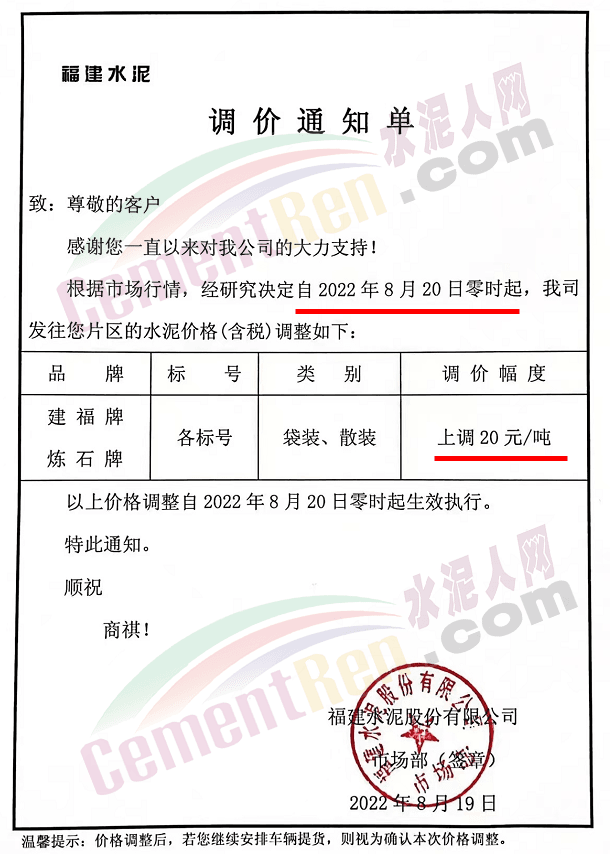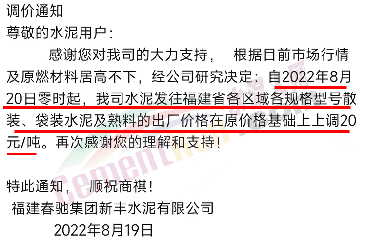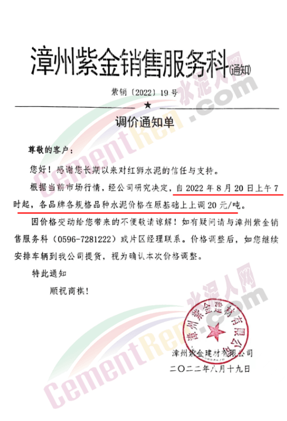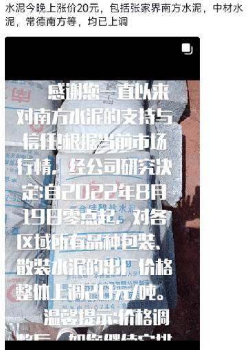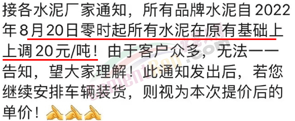 重要通知,8月19日起水泥漲價(jià),32.5、42.5水泥全品種集體上漲。
